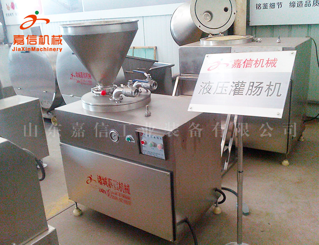 采用活塞式液壓驅動(dòng),調準工作壓力后在液壓缸的作用下,使筒內的物料產(chǎn)生壓力后將料擠出,適用物料范圍較廣,尤其對較干的料餡相對其他灌腸機效果更佳。設備整體結構合理、造形美觀(guān)、性能穩定、操作簡(jiǎn)單、維修方便。